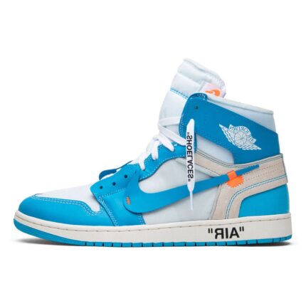 Off-White x Nike Air Jordan 1 Retro High OG UNC is a stunning collaboration between two iconic brands.The Main Color is Blue. The Upper Material is Leather.