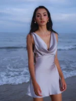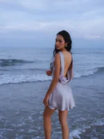 A whisper of moonlight in motion, this silver satin mini dress turns every step into poetry. With its open draped back and delicate sheen, it evokes a quiet kind of seduction — one that lingers like sea breeze on skin.